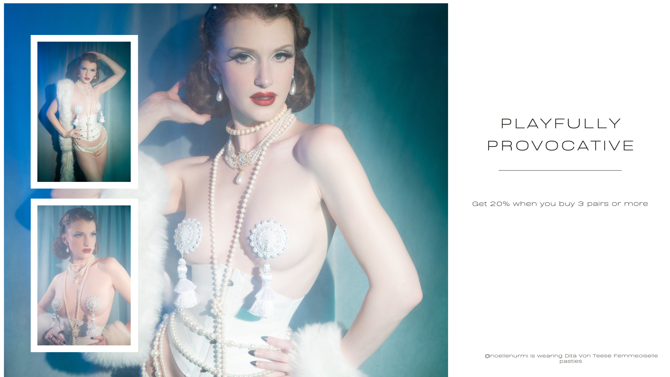 Our nipple pastie are designed to inspire fearless, fashion-forward self-expression—bold, seductive, and designed to celebrate every curve, every personality, and every body. Inspired by the provocative allure of burlesque and the timeless glamour of vintage lingerie, we add a modern twist to redefine intimate fashion. By blending sensuality with playful charm, we bring a fresh take on the art of seduction with each custom nipple pastie design.