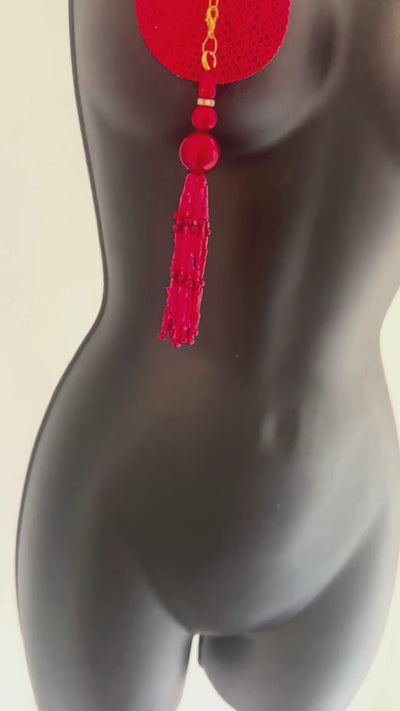 BATON ROUGE Red Shimmer Circle Shape Nipple Pasties Covers (2pcs) with Removable Tassels