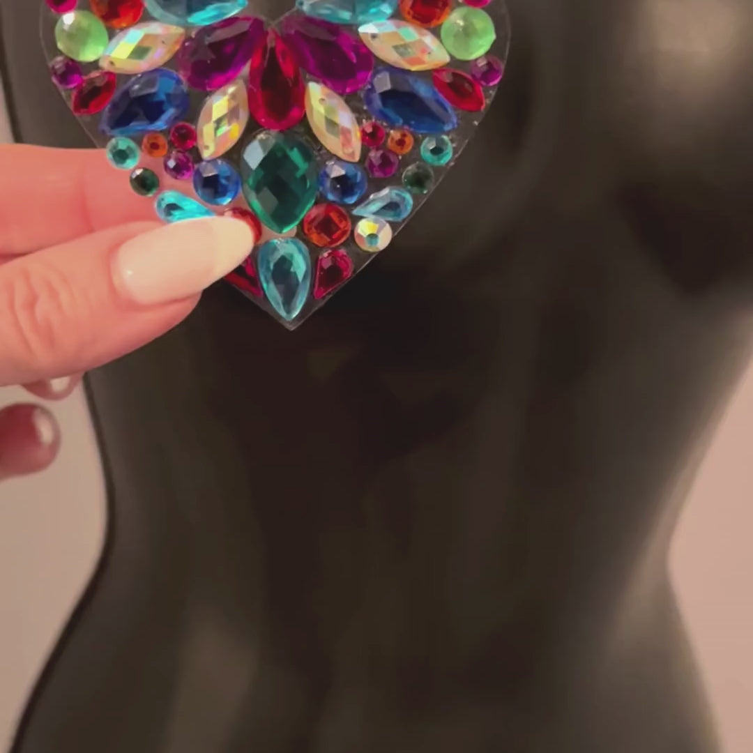 Love Rocks! A perfect way to say I love ME, these HEARTBREAKER multicolor gem heart nipple pasties are super flexible to hug every curve, but also build to last. A stunning personal fashion accessory on your big day or any day, expression of love. Our pasties are handmade with love, and it shows! They are ready-to-wear and come self-adhesive - just peel and stick! Express your love any way want.