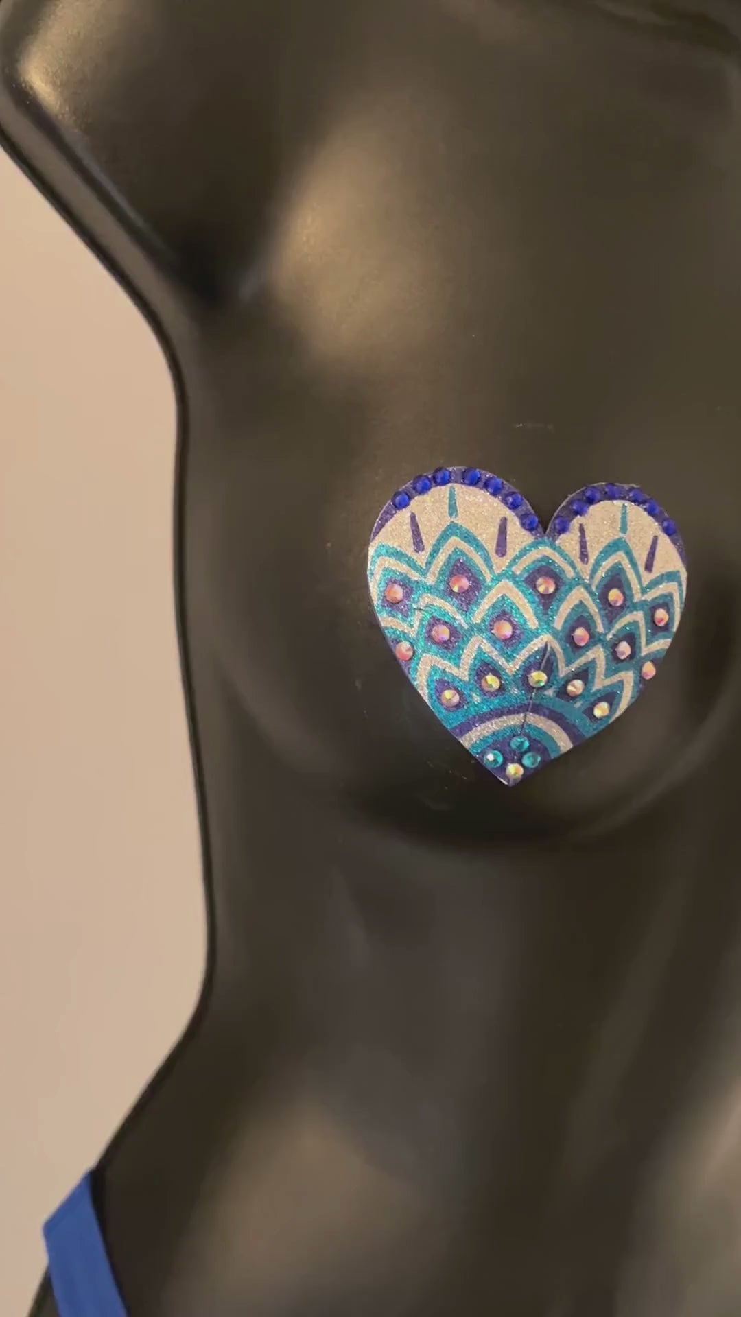 Bejewel your love...for you in blue! These glitter hearts are a bit faberge meets ice princess meets work of art. These nipple pasties are sensationally designed with two shades of blue in an intricate mosaic-like design. Beautiful both in form and function these pasties are Built to last - these hearts are perfectly formed and and handmade with love They have a gentle peak which is designed to highlight any curve. They are ready-to-wear and come self-adhesive - just peel and stick these nipple pasties! These ALI ROSE nipple pasties are resusable if stored properly they can be used for hours of fun and compliment any outfit or attitude. Wear these nipple pasty as part of your and festive fun and as lingerie wardrobe, burlesque outfit, costume or just with a smile. Celebrate your body, your love, your way.