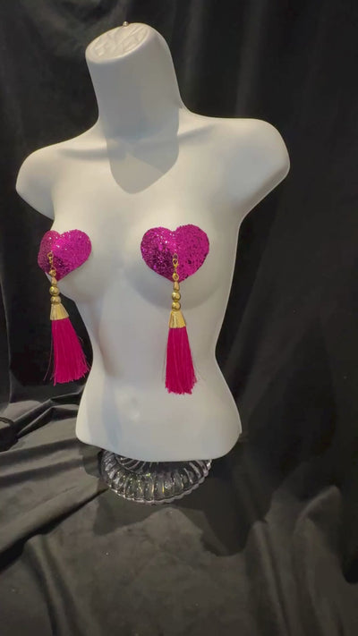 LUVA Hot Pink Heart Glitter Nipple Pasties, Pasty (2pcs) - With Removable Lightweight Tassels