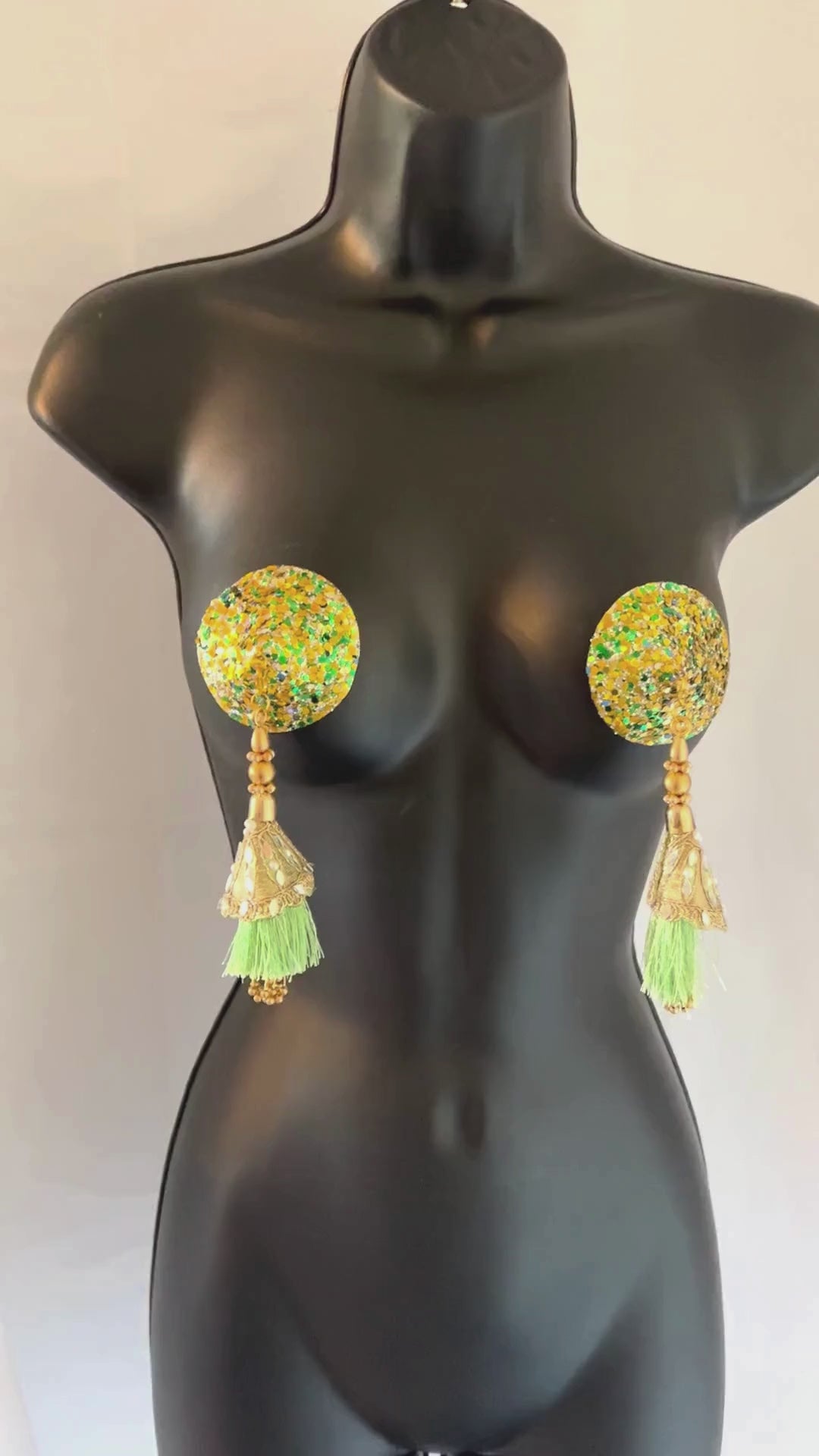 MOJITO Green and Gold Circle Glitter Nipple Pasties, Pasty (2pcs) with Removable Beaded Tassels 2pcs Burlesque Lingerie Raves and Festivals