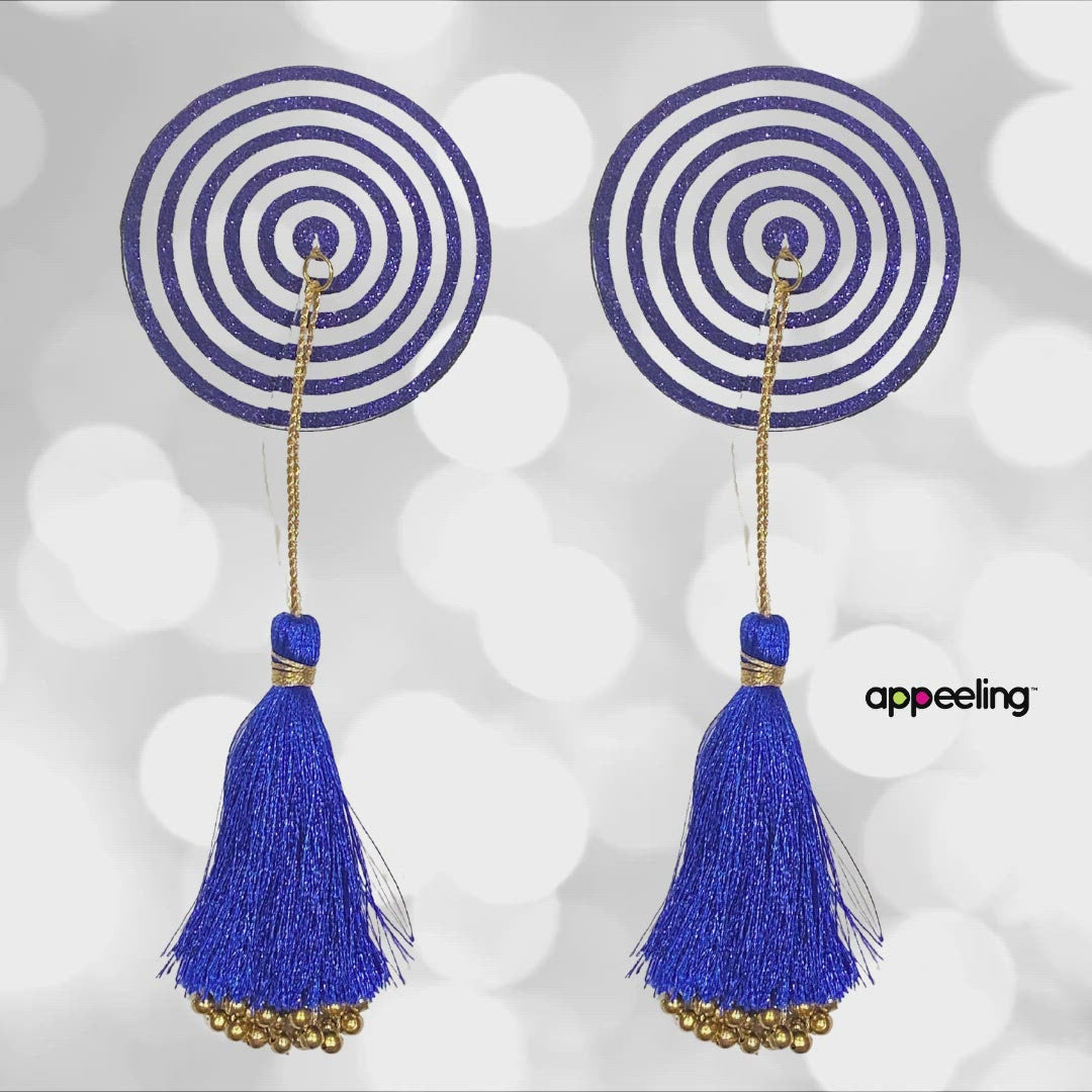 Add a little magic wherever you go. These stunning blue and white glitter pasties are handmade gems destined to be a unique addition to any outfit and every mood. These are reusable and made to maximize twirling with a unique technique in the fastening of the tassel. The bold tassels have a unique gold tassel woven into the middle – a perfect standout, just like you!