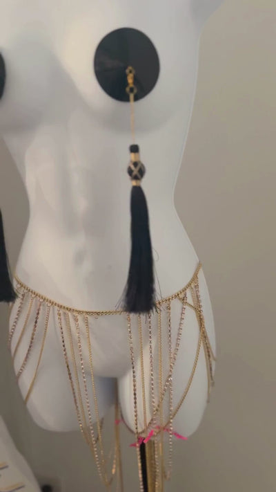 Pure rock and roll vibe, these REBEL YELL nipple pasties are designed to unleash your inner stage queen. These unique pasties feature vegan patent black leather. The addition of extra-long thick black removable tassels with a hint of gold thread adds a touch of luxury and a playful element. Crafted to enhance your natural curves, these pasties are not only visually appeeling but also easy to wear - simply peel and stick for instant glamour.