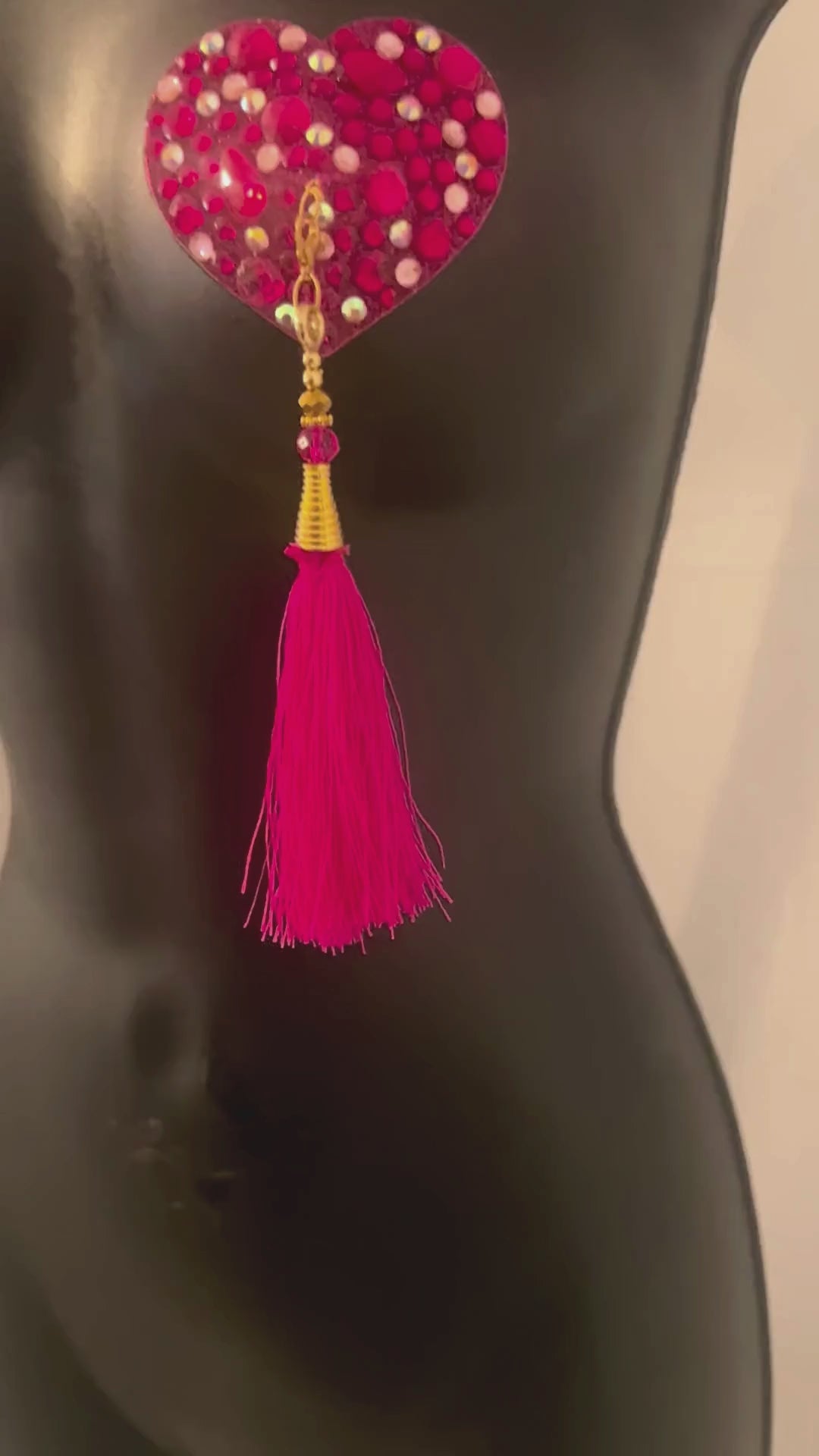 Oooh la la....share your love in FULL glory with these ROXY HEART nipple pasties. Despite their big, bold appearance, they are lightweight which makes them perfect to effortlessly add sensational sparkle and style. The tassels are removable and you can rotate this design for your preferred look. Intricate and one of a kind and handmade with love. Say it all without saying a word gorgeous!
