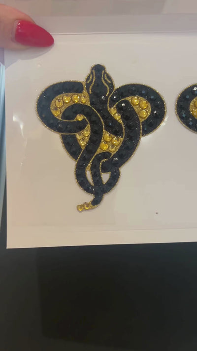 Charm your way into the spotlight with SERPENTINE Snake Pasties, the ultimate accessory for the dangerously chic. Available in captivating Green & Gold or seductive Black & Gold, these pasties slither across your skin with an irresistible allure. Whether you're turning heads or keeping secrets, their charming design adds a touch of mystery and magic to any look. For the bold and the fearless, SERPENTINE is the perfect mix of charm and seduction, ready to charm anyone in your path. Perfect for the femme fatale who's not afraid to stand out!